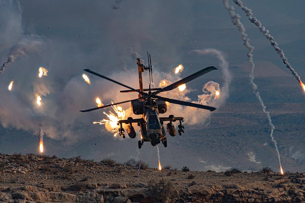 The engine exhaust and the rotor’s prop wash from an Israeli Air Force Boeing AH-64A Apache “Peten” creates art in the sky as the aircraft drops flares during the blue hour in the desert.
