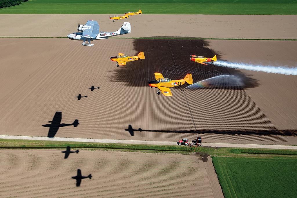 A farmer spraying very dry land added an extra rainbow dimension to the farewell of a Catalina PBY-5A departing the Netherlands on May 29 to join the Collings Foundation fleet. It was accompanied by four Fokker S-11 “Instructor” aircraft and a Dutch-based AT-6 Texan.
