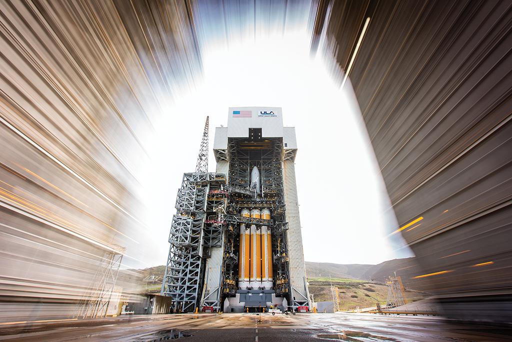 The Mobile Assembly Shelter rolls back to its launch position at Space Launch Complex 6 at Vandenberg AFB, California, revealing the United Launch Alliance Delta IV Heavy.