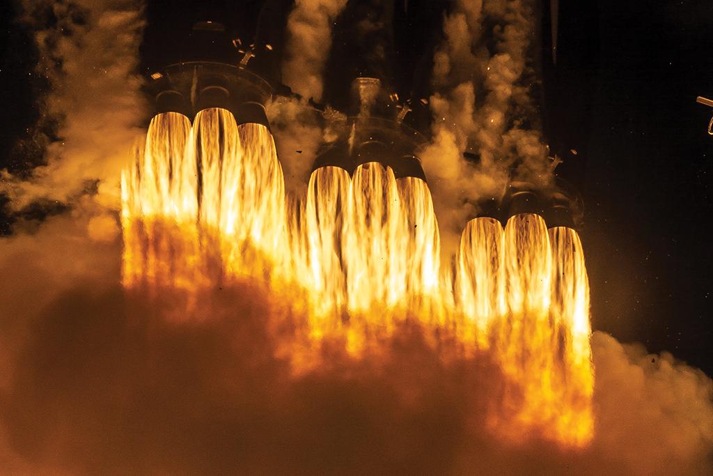 Twenty-seven Merlin engines lift a Falcon Heavy off Pad 39A at the John F. Kennedy Space Center and into orbit with Arabsat 6A onboard.