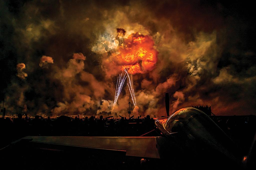 The grand finale of the Wednesday evening air show at the Experimental Aircraft Association’s AirVenture 2019 in Oshkosh featured a mushroom-cloud-like fireball named “Dun-Diehl SuperNuke” by creator Dion Diehl, president of DTG Pyrotechnics. Extra Aircraft’s just-released Extra NG next-generation aerobatic aircraft sits in the foreground.