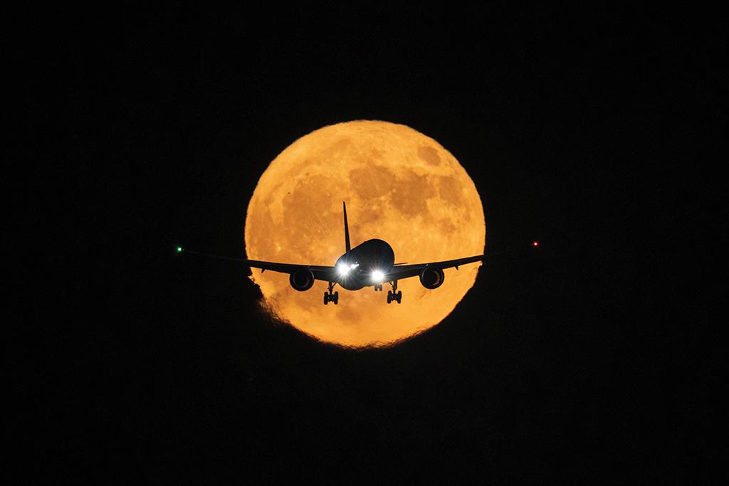 A Boeing 787 lined up for final approach to Runway 24R at Los Angeles International Airport ahead of an autumn full Moon.