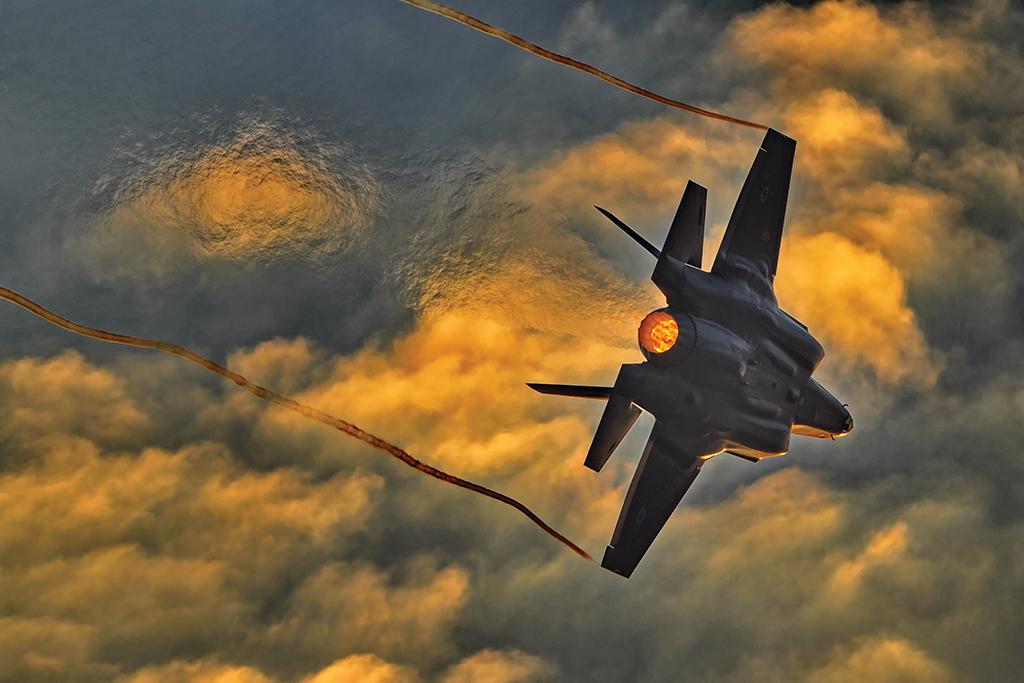 The afterburner of an Israeli Air Force Lockheed Martin F-35i Adir kicks in over the desert at sunset.