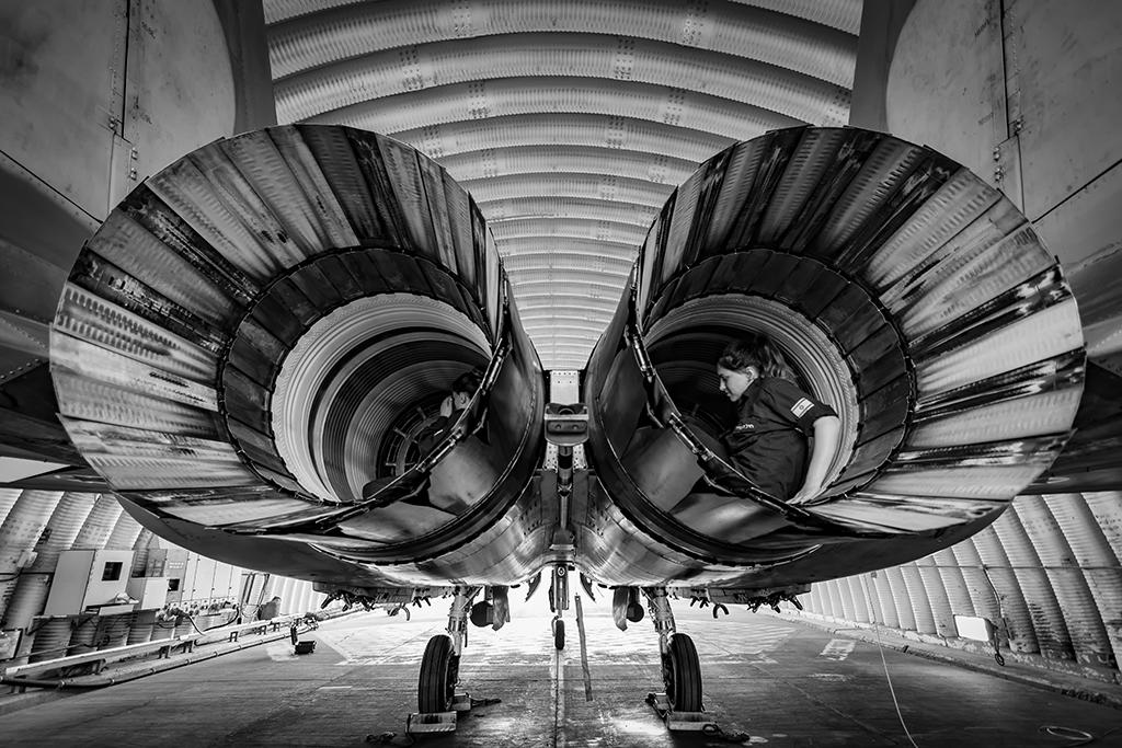 Symmetric in all aspects, this Israeli Air Force McDonnell Douglas F-15I “Thunder” is having its exhaust plates inspected by two technicians—one in each engine exhaust. Everything checks OK.