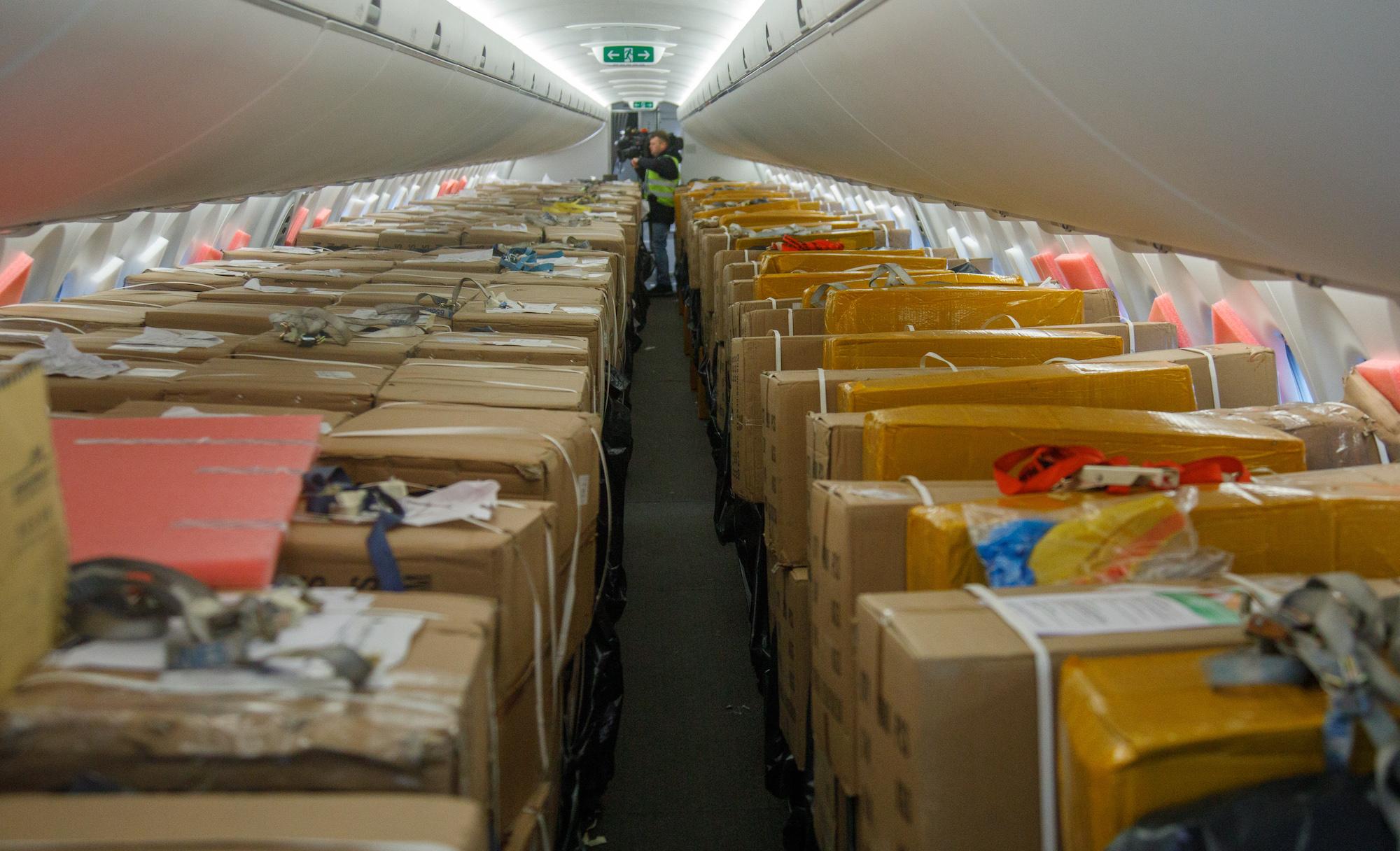Overall, 619 boxes, 5.1 tonnes or 47 cubic meters of approximately 900,000 face masks and 80,000 respirators were carried. Three pilots and two technicians were on board the aircraft to perform the flight.