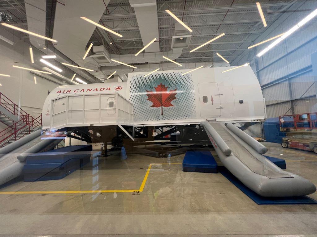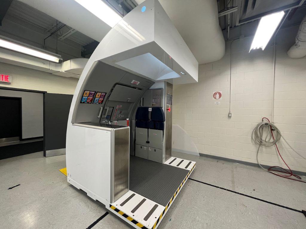 A full motion cabin crew safety trainer awaits its next exercise at the carrier’s Montreal training facility.