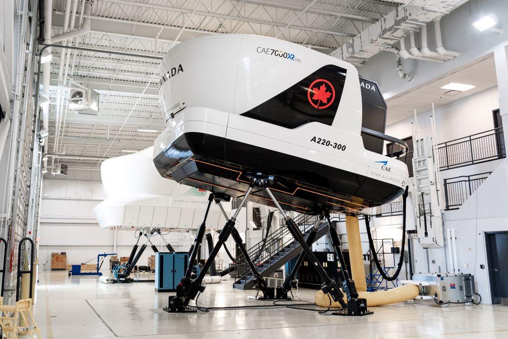 A CAE7000 XR Airbus A220 Full Flight simulator at CAE Aviation Training and Services Toronto. The facility houses Air Canada’s fleet of simulators as well as four CAE-owned and operated FFs. CAE and Air Canada share management responsibility for the training center. Air Canada has 33 A220-300s delivered its fleet with 27 on order.