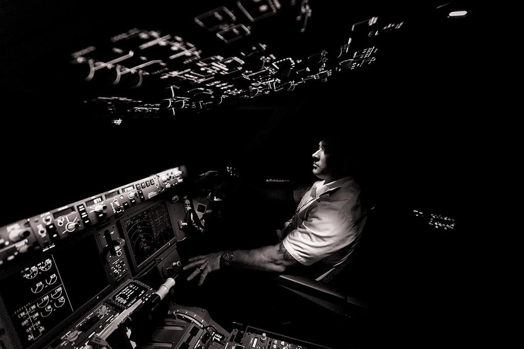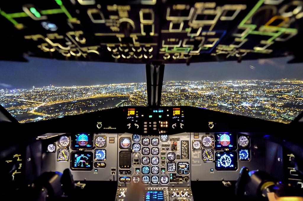 My first officer poses for a night cockpit shot somewhere over the western United States.