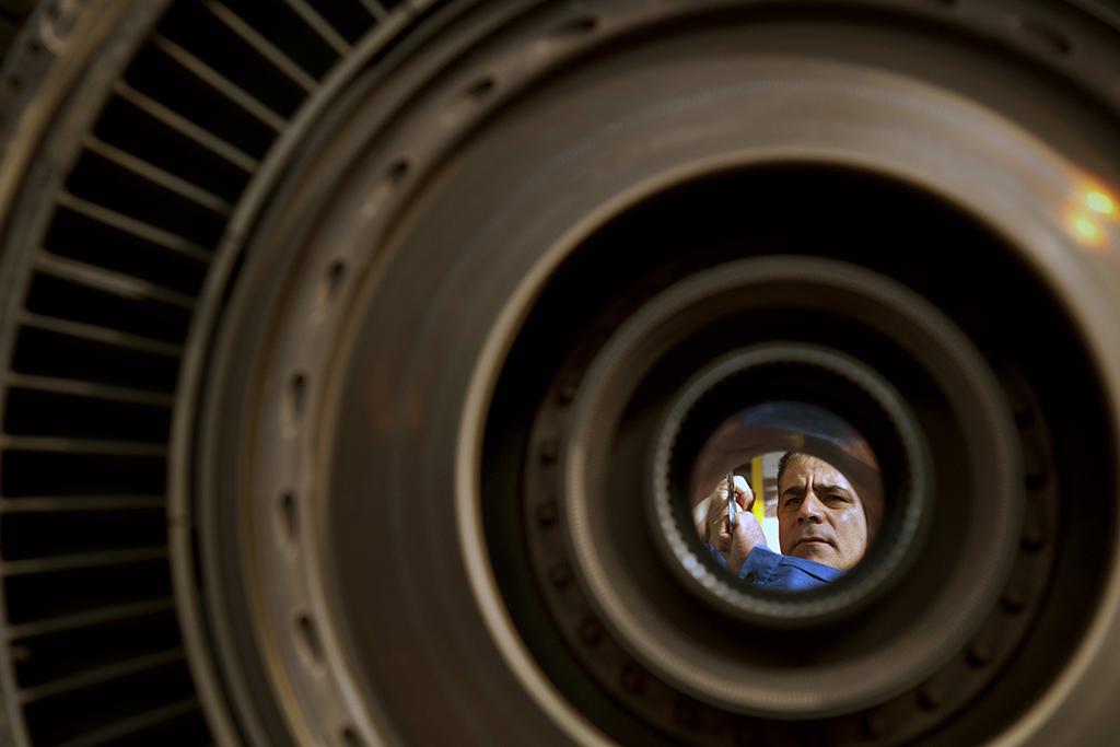 A technician peers through the core of a jet engine in Iran.