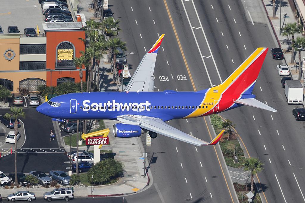 A Southwest Airlines Boeing 737 passes over the famous In-N'-Out Burger just prior to landing at Los Angeles International Airport.