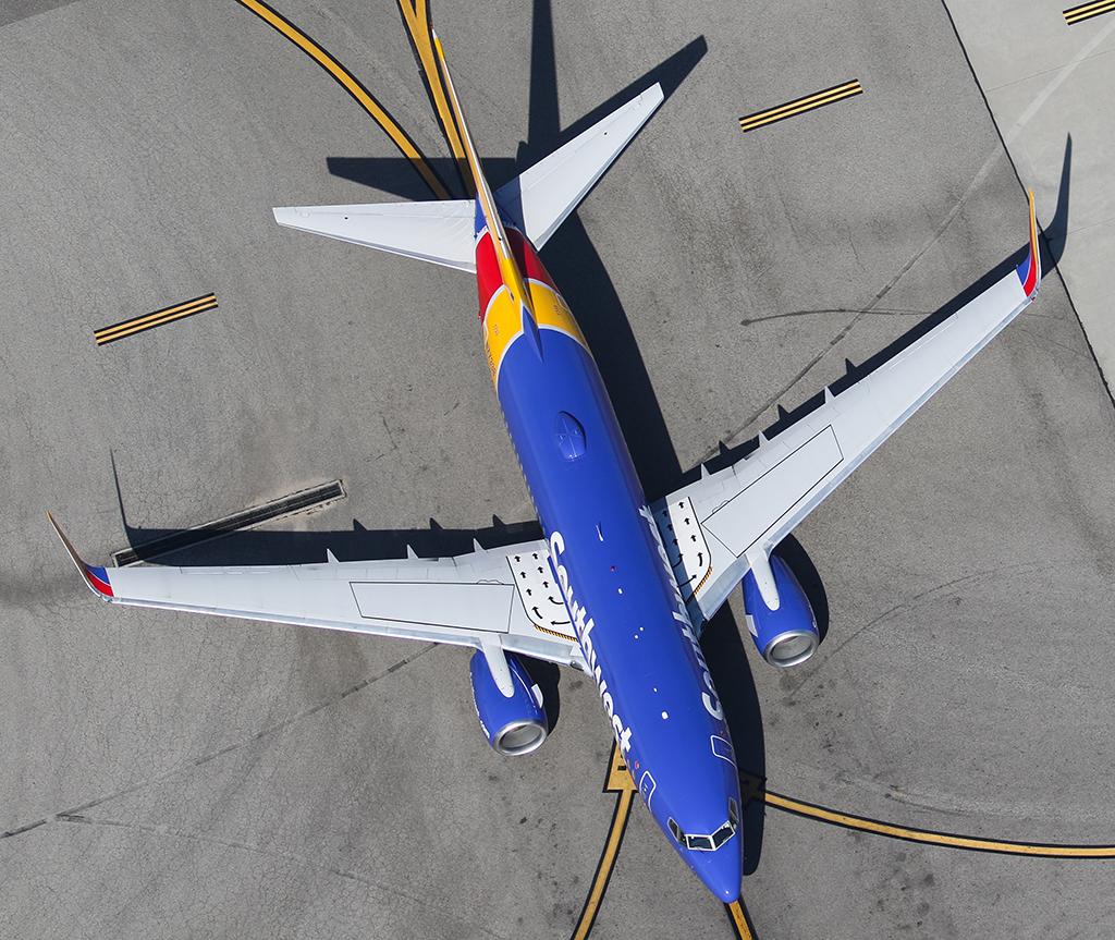 Looking directly down at a Southwest Airlines Boeing 737 in the airline's new livery while it taxis to its gate at Los Angeles International Airport.