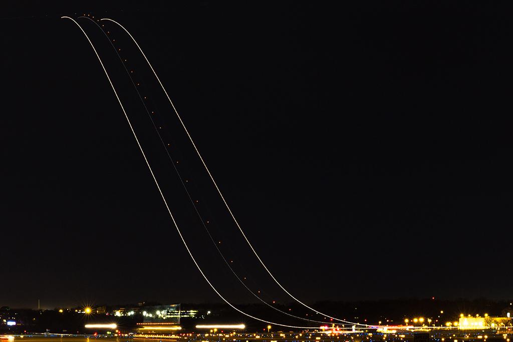 A 30-second exposure of the de-icing process in the early morning hours on the ramp at Springfield-Branson National Airport, Springfield, Missouri.