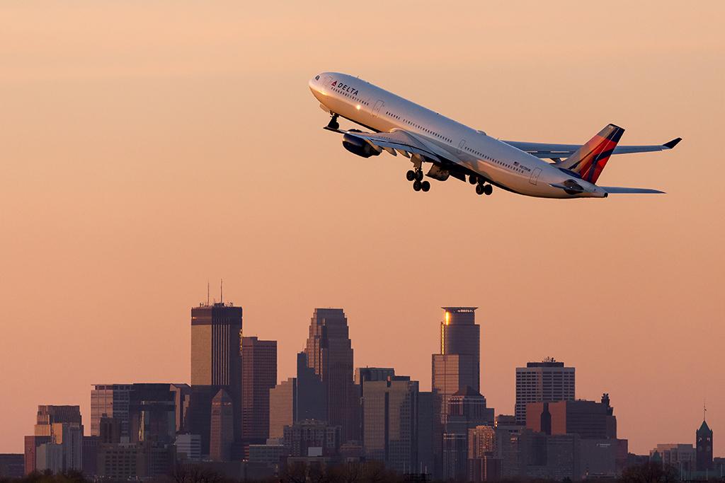 A Delta Airbus A330-300 climbs out of Minneapolis on a warm spring night as it prepares to race away from the setting sun toward Amsterdam.