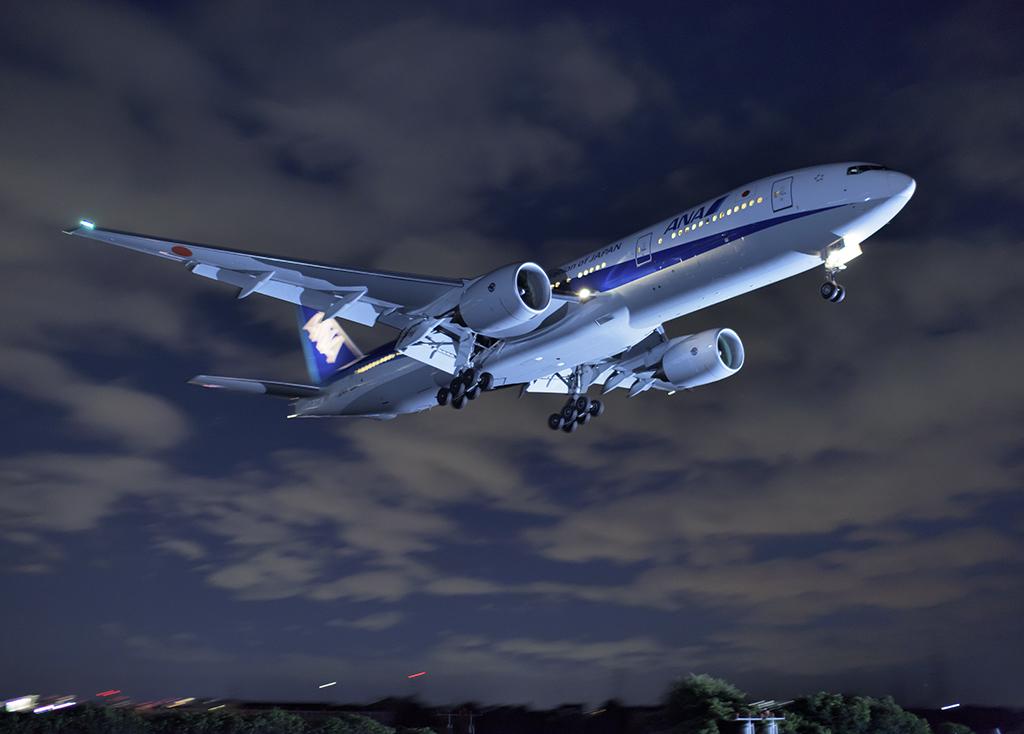 An All Nippon Airways Boeing 777 on final to Osaka-Itami airport in the evening.