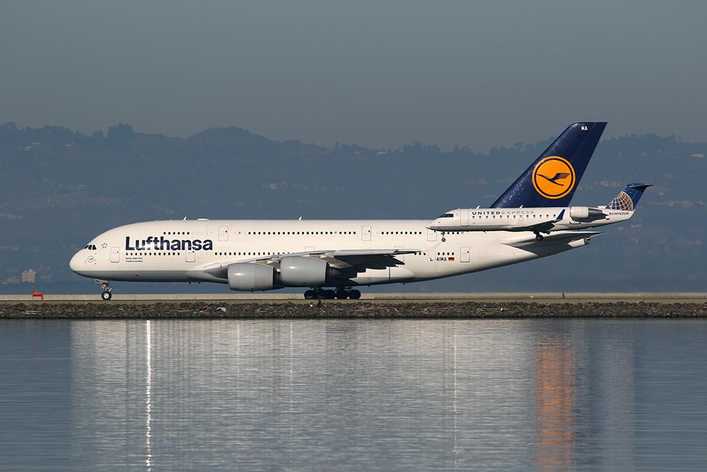 A Lufthansa A380 awaits departure clearance on Runway 28R while a United Express/Skywest CRJ-200 lands on Runway 28L. The CRJ can easily be confused as an appendage on the Super Airbus!