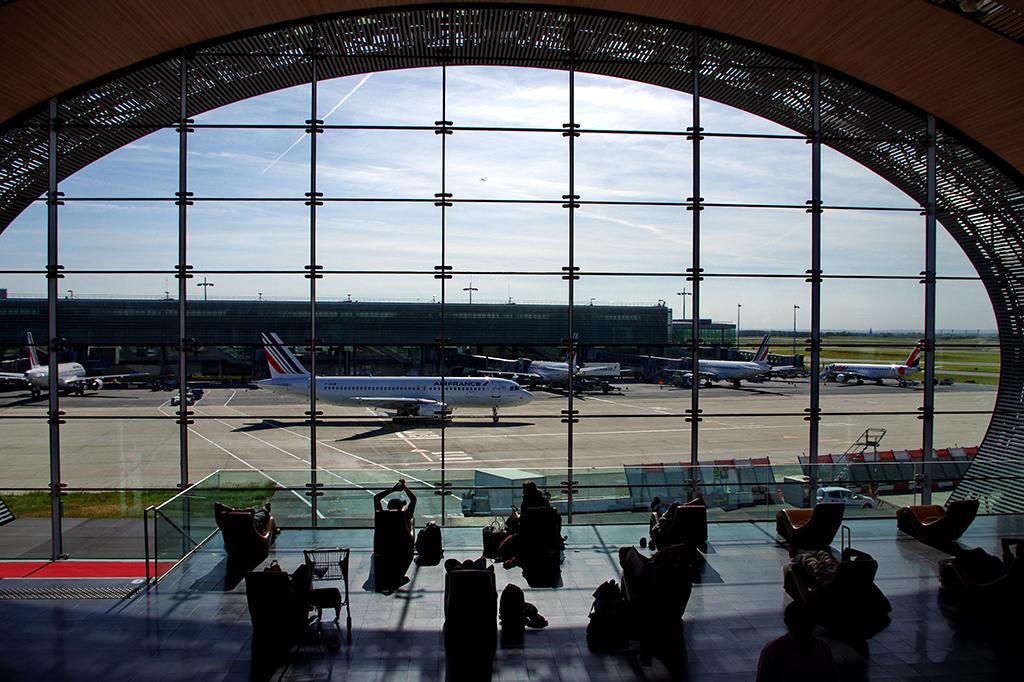 View from the end of Terminal 2E at Paris-Charles de Gaulle International Airport with planes moving in the air and on the ground.
