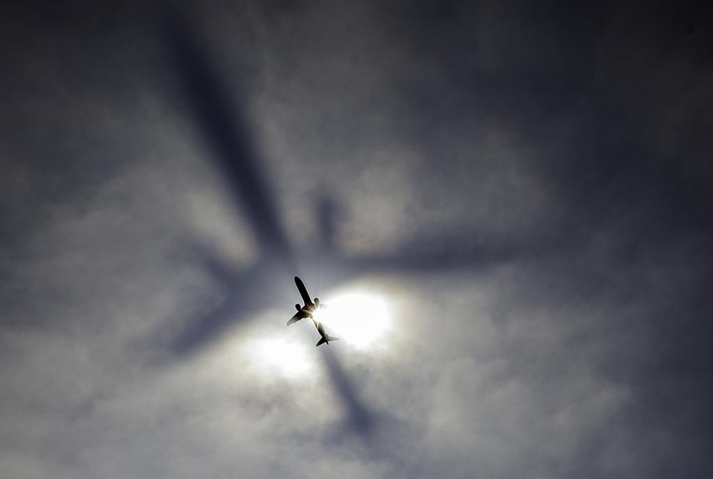 JetBlue Flight 951 leaves Boston's Logan International Airport in heavy fog, casting a shadow as it passes the sun.