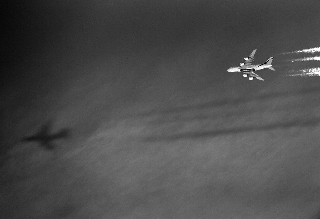 Over Boston, the massive Emirates Airbus A380, Flight EK204 from New York John F. Kennedy International Airport to Dubai shadows itself.