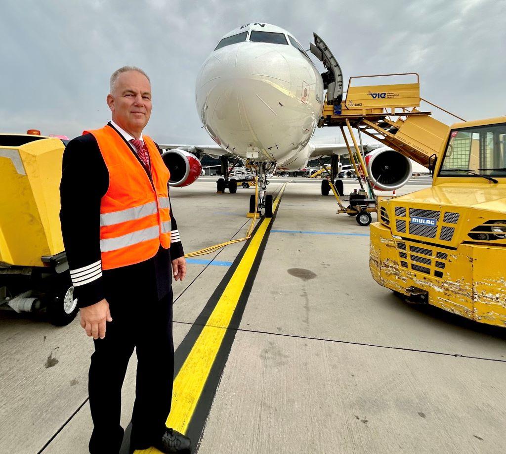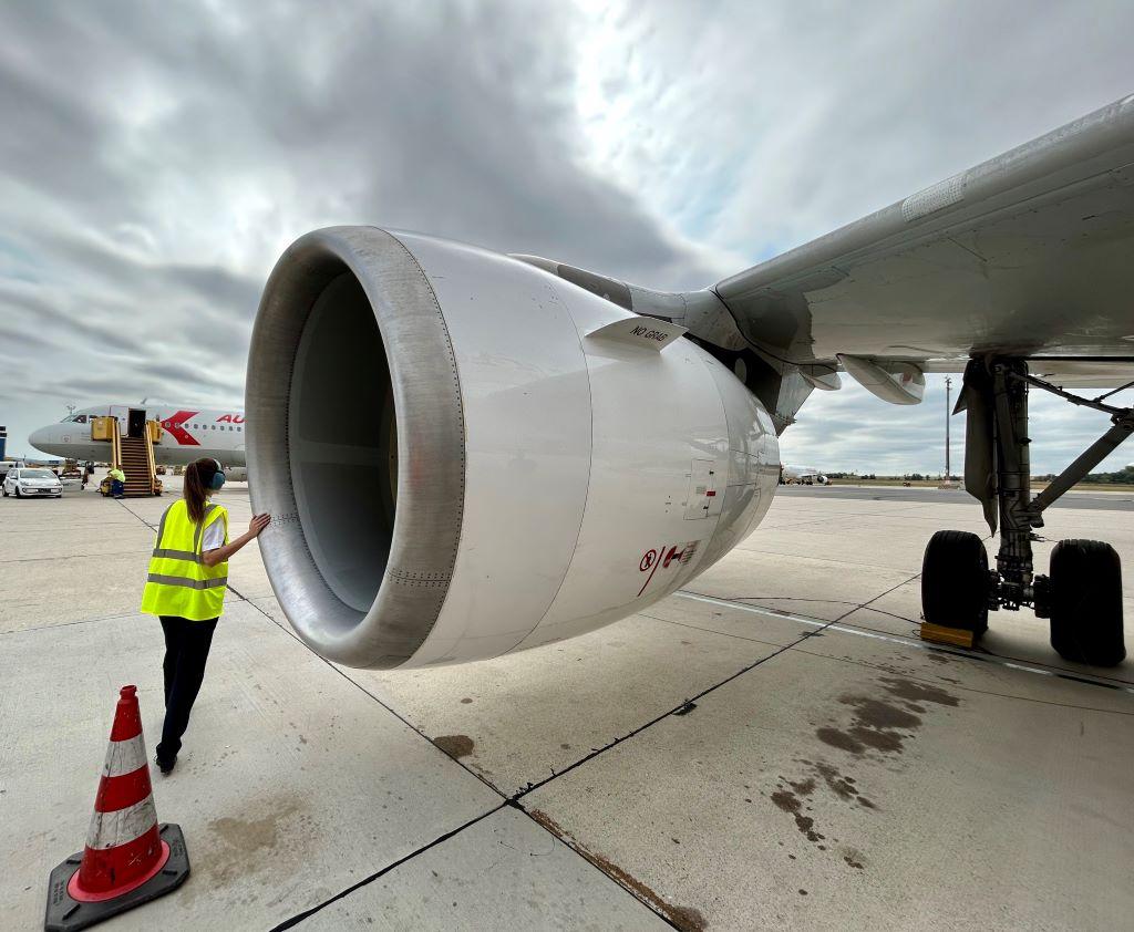 As Captain Radl prepares the cockpit of the new A320 (#OE-LBJ), first officer Gruhn does the outside check. In principle, the pilot flying the aircraft prepares the entire cockpit, including managing the flight and suggesting the required fuel, with the captain making the final decision. The assistant pilot does the walk-around.