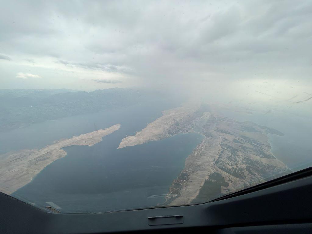 The weather has changed. Both pilots constantly monitor the weather situation. “Bora” is what the strong winds are called on the Adriatic Sea coast. Today the strong winds are reaching up to 40 knots (46 mph). The alternate airport identified for the Vienna-Zadar service would be Graz Airport in Austria. Leaving flight level 310 (9,500 meters), the aircraft passes over the coastal landscape of Croatia.
