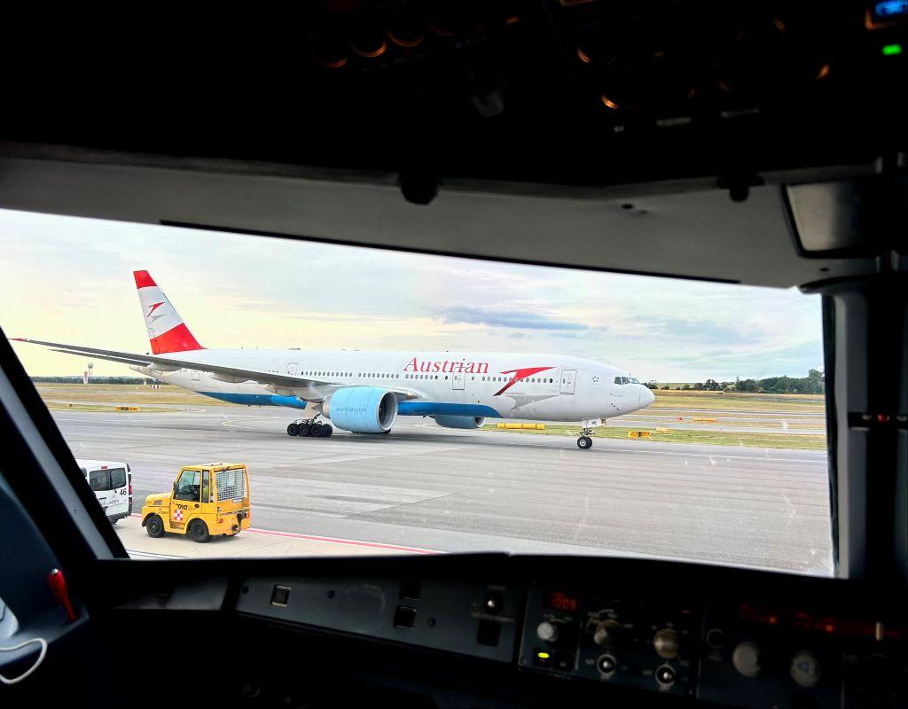 After 1 hr. and 10 min., the Austrian Airlines’ A320, registration #OE-LBN, landed ahead of schedule in Vienna, this time piloted by Radl. An Austrian Boeing 767 is seen from a window.