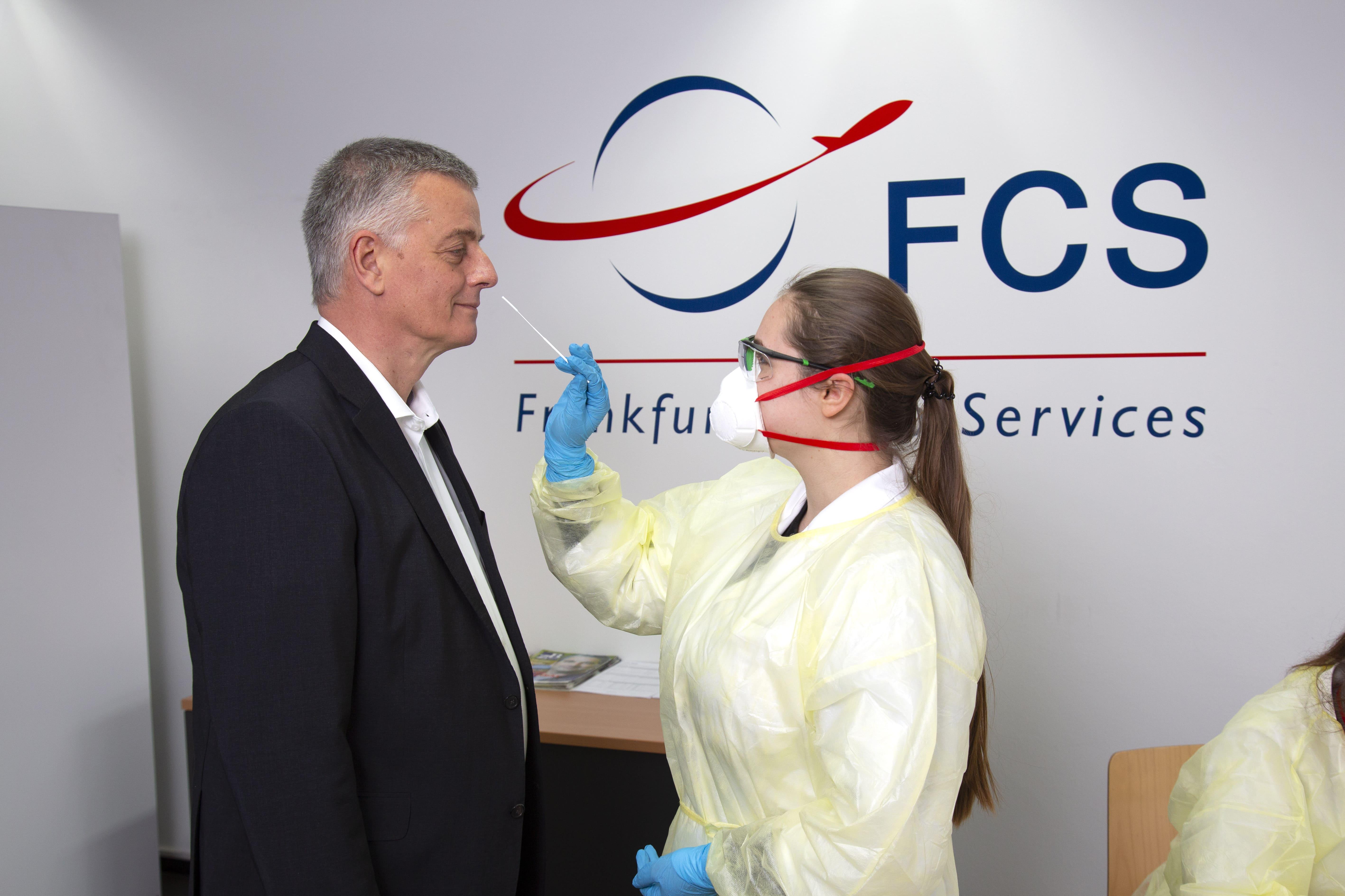 In the first week of January, a large-scale COVID-19 testing campaign was conducted at Frankfurt Airport by the three major air cargo handling companies FCS Frankfurt Cargo Services, LUG aircargo handling and Perishable Center Frankfurt (PCF). A total of around 1,500 employees of the companies, which together handle around 40% of the air freight at Frankfurt Airport, was tested. Over several days, the Bensheim-based company Chemlab conducted the tests on site. The aim of the measure is to ensure even better protection of the workforce against infection in the company. Photo caption: FCS managing director Claus Wagner is tested.