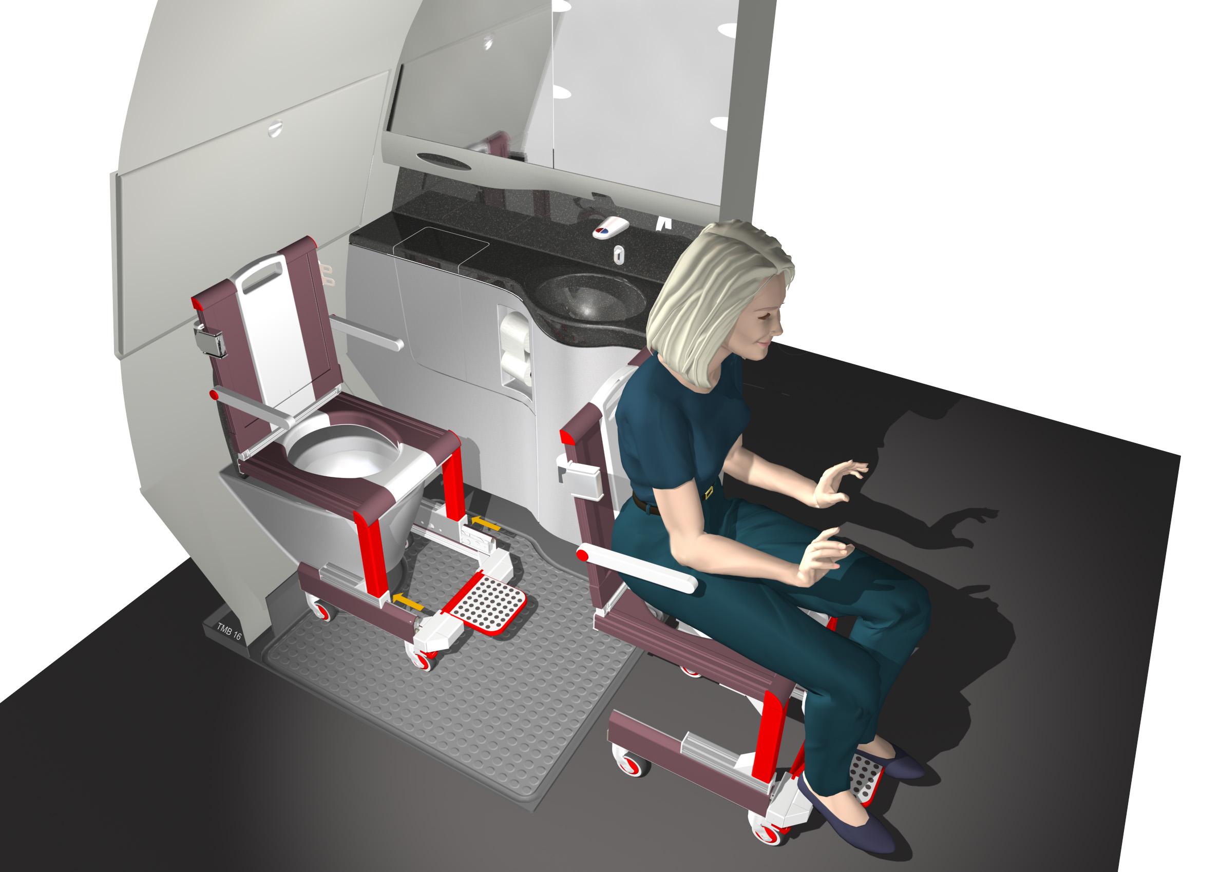 A lightweight onboard wheelchair designed by the Hamburg University of Applied Sciences promises to improve mobility through the cabin aisle and provide more hygienic lavatory usage with its ‘over toilet functionality.’ The concept is the only device for passengers with reduced mobility that eliminates the need to transfer onto the toilet seat.