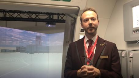 Virgin Atlantic training design consultant Tom Curtis demonstrates the airline's augmented reality Airbus A350 escape slide crew training device.