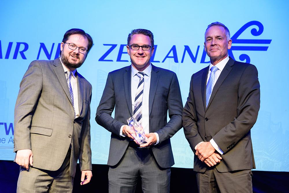 ATW senior editor Aaron Karp with Air New Zealand head of sustainability James Gibson and Capt. Philip Kirk