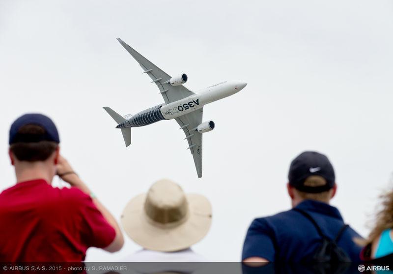 Attendees of EAA AirVenture Oshkosh 2015 watch Airbus’ new-generation A350 XWB fly over the air show, which is billed as the world’s greatest aviation celebration.