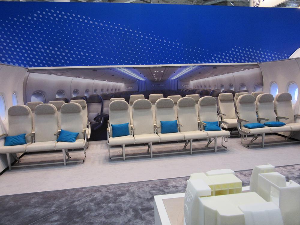 The 11 abreast economy cabin seating configuration revealed by Airbus at the Aircraft Interiors Expo in Hamburg, Germany April 14-16, 2015. Front row seats are Geven Piuma seats; back row are Zodiac Z300s. There have been no commitments for this configuration so far, but Airbus says it is in talks with some A380 operators. Photo by Karen Walker
