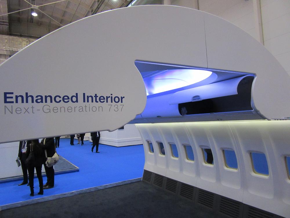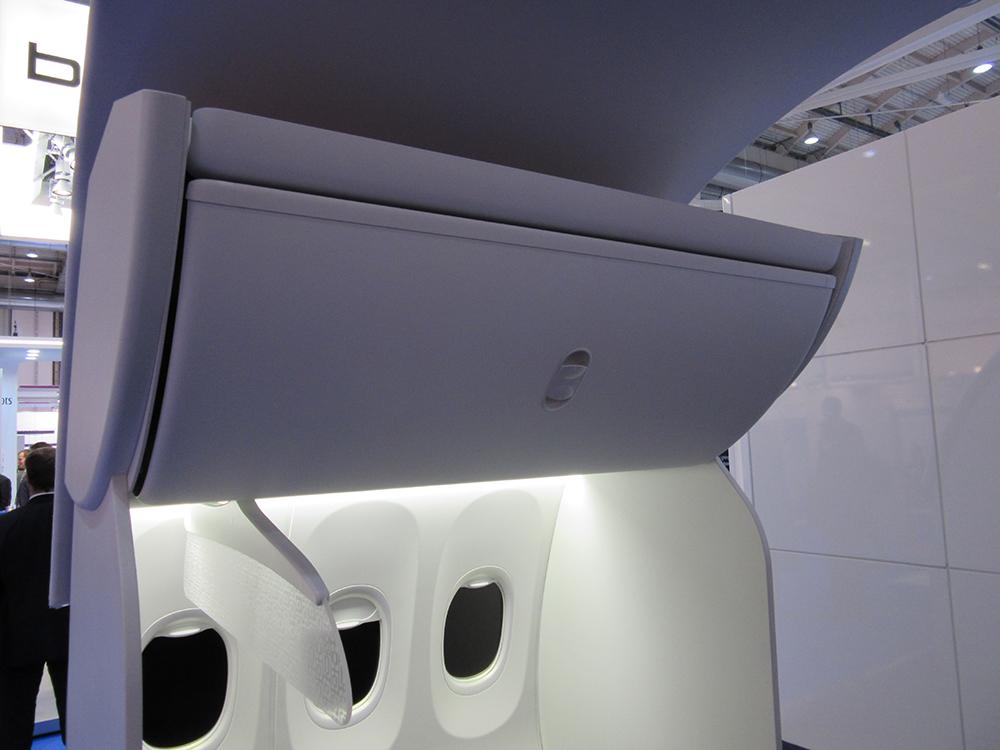 Boeing displayed its new roomier overhead bins, called Space Bin, for the 737. Each Space Bin holds six standard carry-on bags, two more than the current Boeing Sky Interior pivot bins. That allows for 194 total bags on a 737-900ER or 737 MAX 9, compared to 132 in the current bin configuration; 174 compared to 118 on a 737-800 or 737 MAX 8; and 130 compared to 90 on a 737-700 or 737 MAX 7. Photo by Karen Walker
