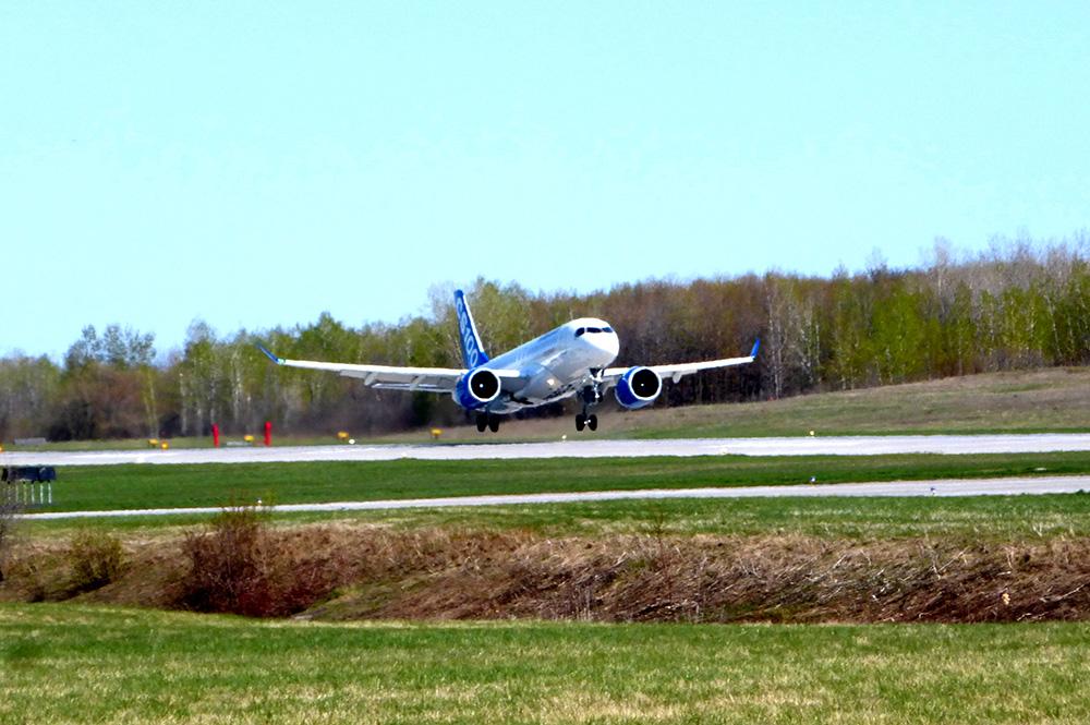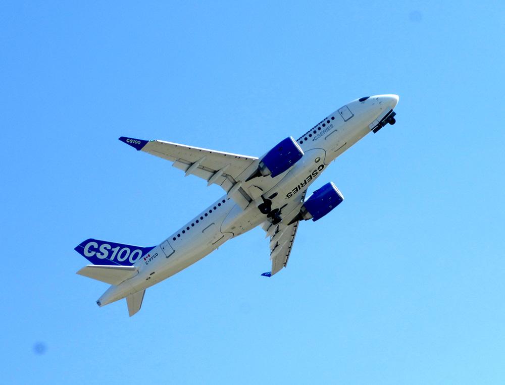 The CS100 route-proving aircraft, which flew through North America and Europe, on the tarmac at Montreal-Mirabel International Airport.