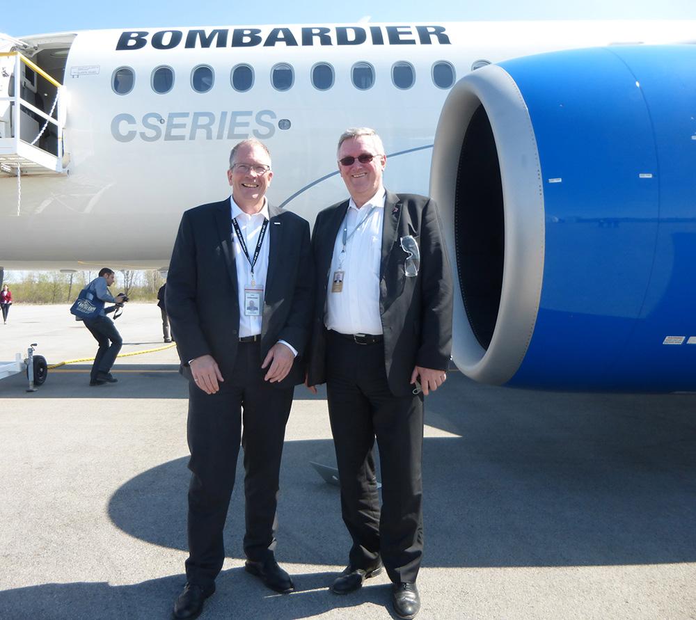 Bombardier VP-CSeries program Rob Dewar and Swiss International Air Lines chief technical officer Peter Wojahn. SWISS expects to have nine aircraft in service this year.