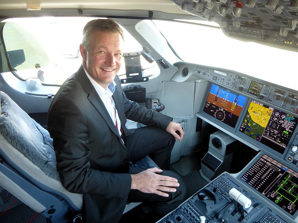 SWISS CSeries program manager and fleet chief Peter Koch in the spacious cockpit. SWISS will have 34 pilots ready to fly the CSeries when scheduled operations begin in July.