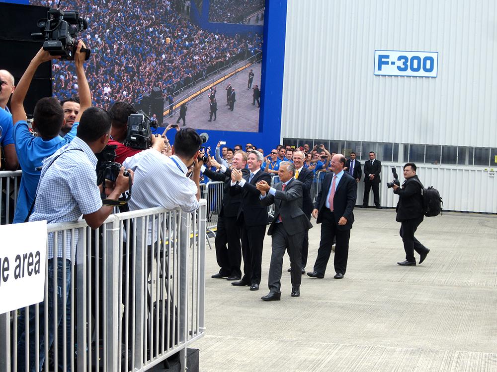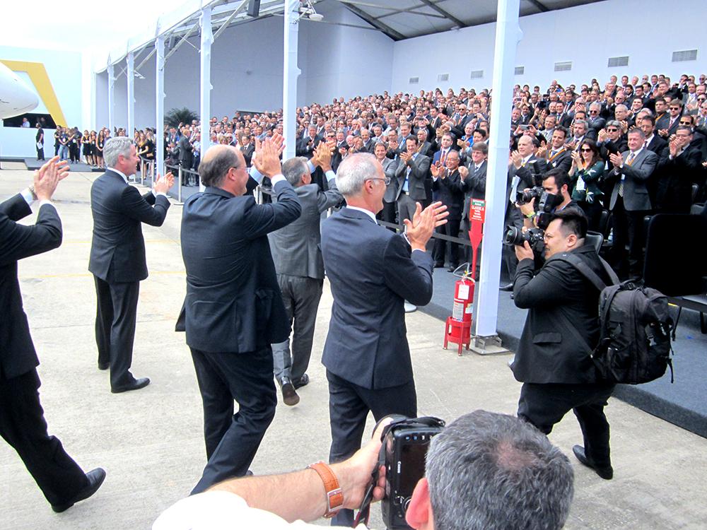 Embraer Commercial Aviation president and CEO Paulo Cesar Silva and Embraer Commercial Aircraft CCO John Slattery applaud press.