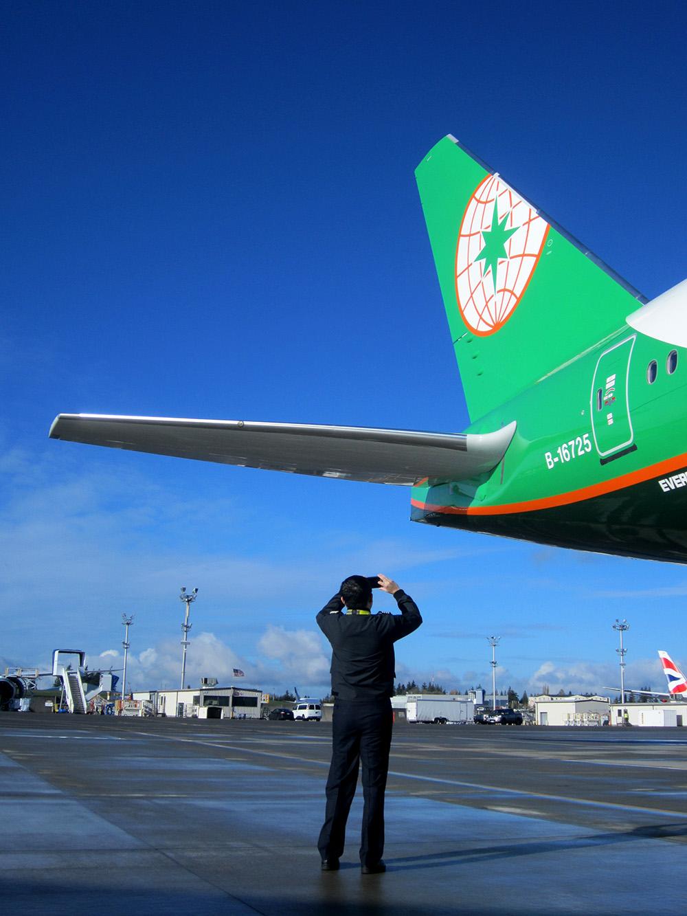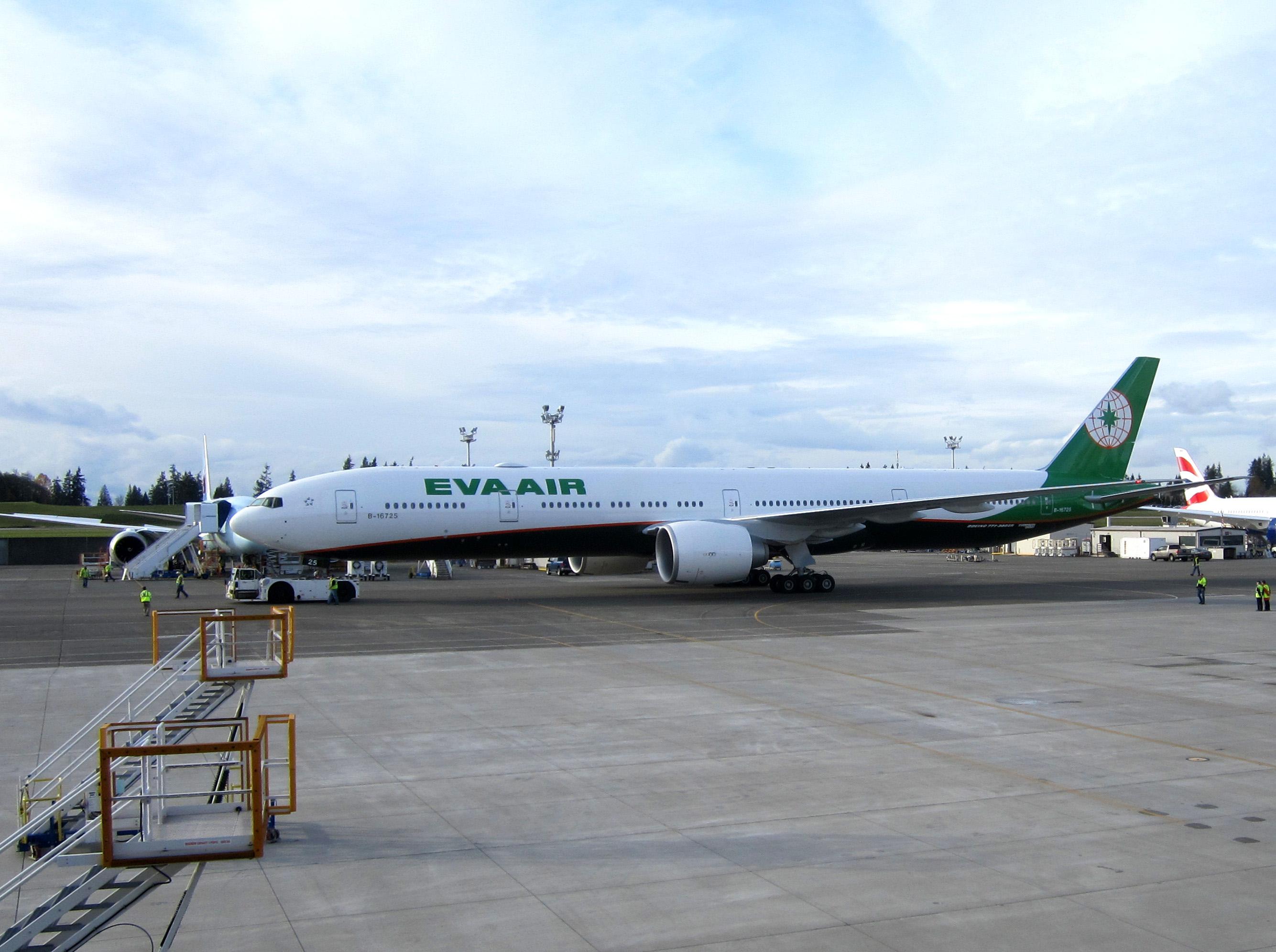 Taiwan-based EVA Air has taken delivery of its first re-branded Boeing 777-300ER at the US manufacturer’s delivery center in Everett, Washington Nov. 10-11. While being the 22nd 777-300ER in EVA’s fleet, the new aircraft debuts EVA’s new livery design and corporate identity. The aircraft’s simplified tail design features a compass as its focal point, borrowed from EVA’s corporate parent Evergreen Group; the aircraft’s underbelly is now a dark-green with a curved orange borderline. Photos by Mark Nensel