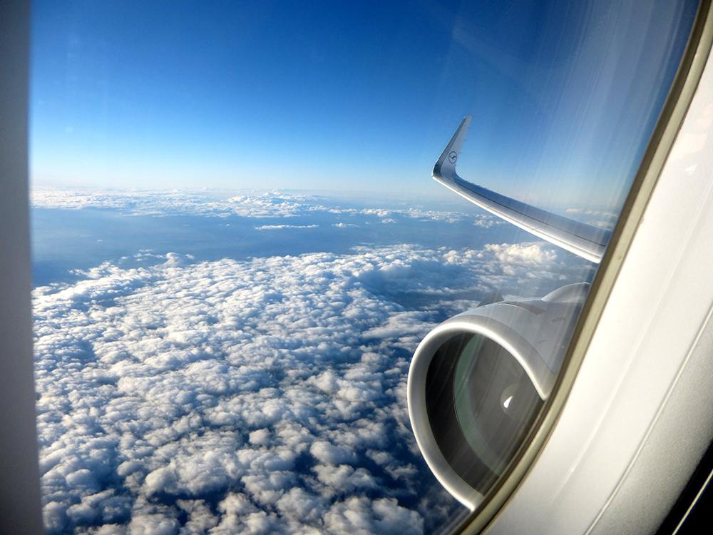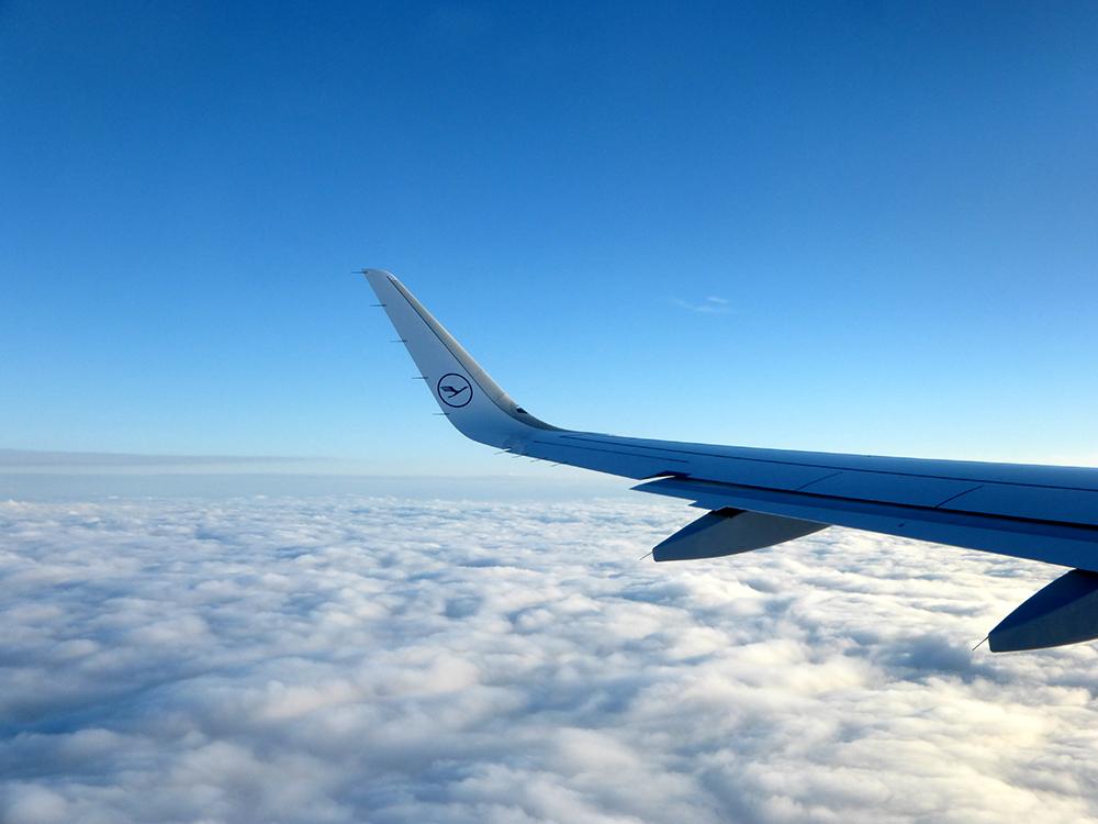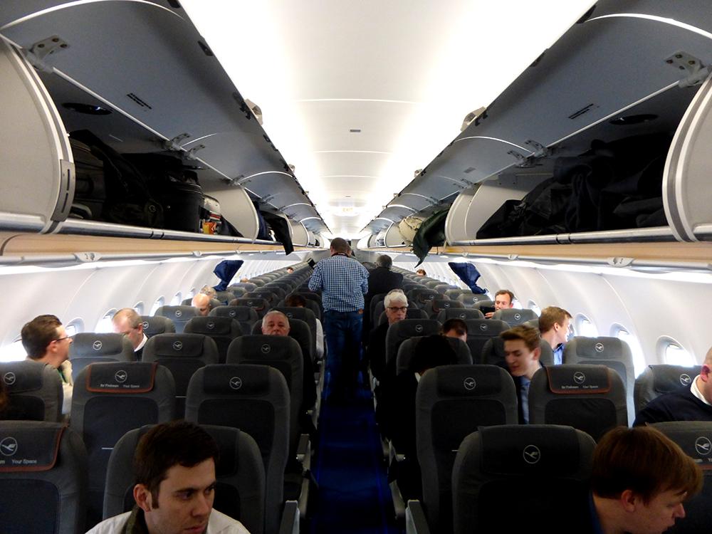 A friendly Lufthansa flight attendant welcomes the passengers on this special flight to Frankfurt.
