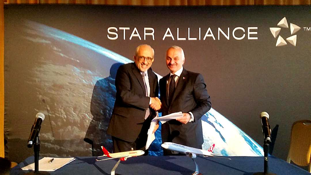 Avianca Brazil CEO Jose Efromovich (L) and Turkish Airlines CEO Temel Kotil (R) shake hands after signing a codeshare agreement at the Star Alliance chief executive board meeting in Chicago.