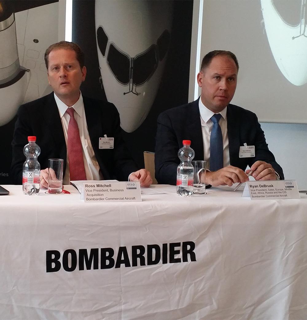 Bombardier has reiterated its commitment to the CSeries, which is 90% through certification, after recently disclosing that partnership talks with Airbus had been called off. Photo: Bombardier Commercial Aircraft VP-business acquisition Ross Mitchell and Bombardier VP-commercial aircraft sales Ryan DeBrusk