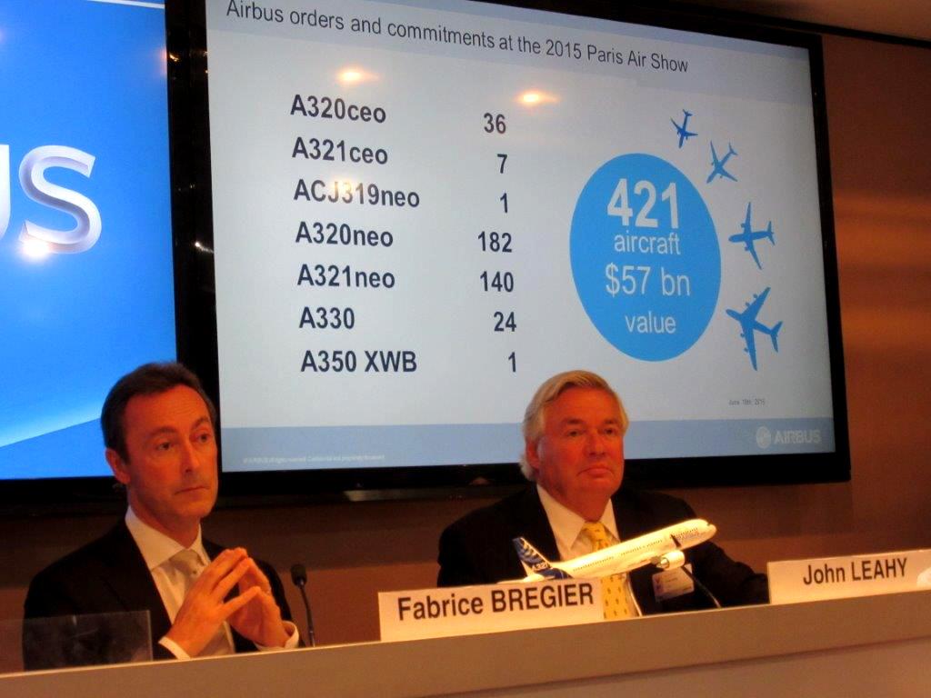 Airbus president and CEO Fabrice Bregier with Airbus COO-customers John Leahy during an Airbus news briefing wrapping up the Paris Air Show.