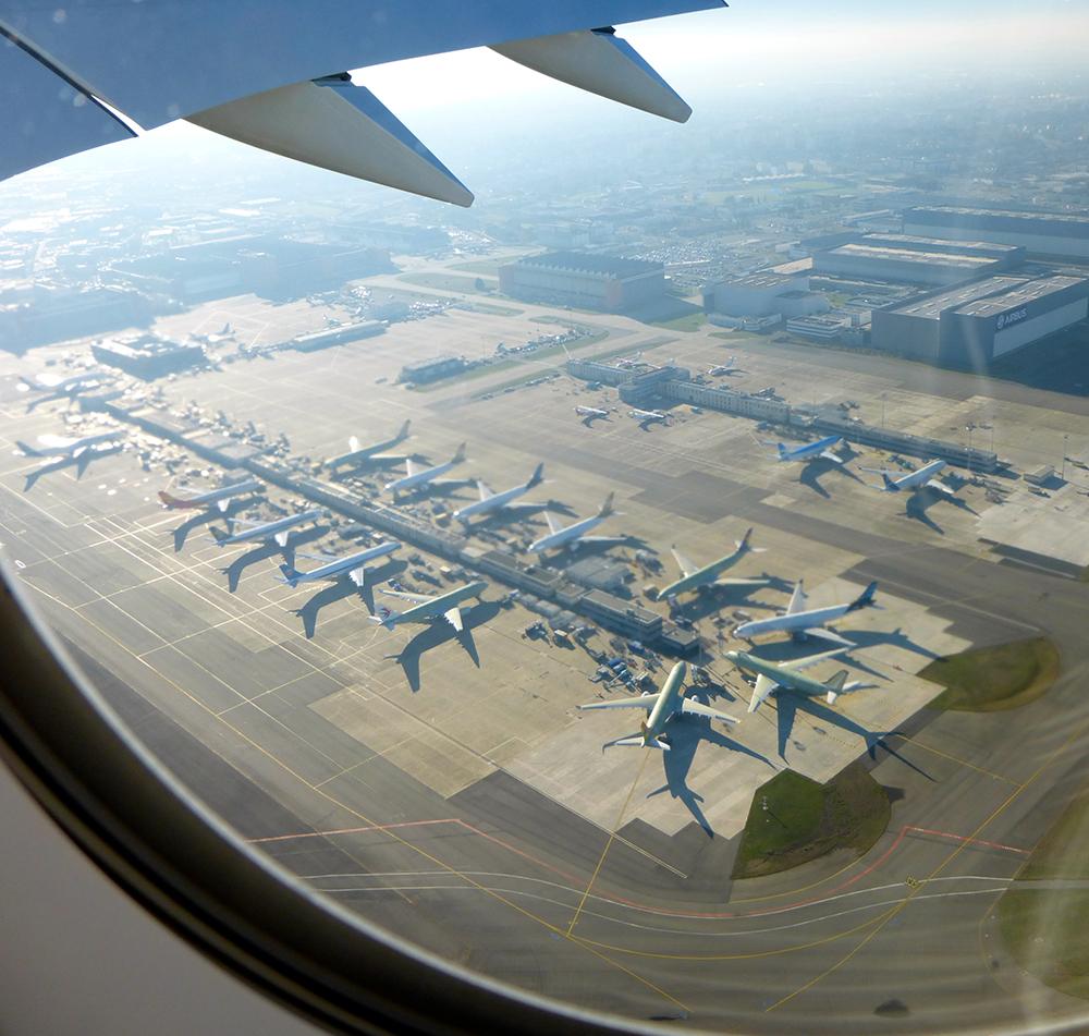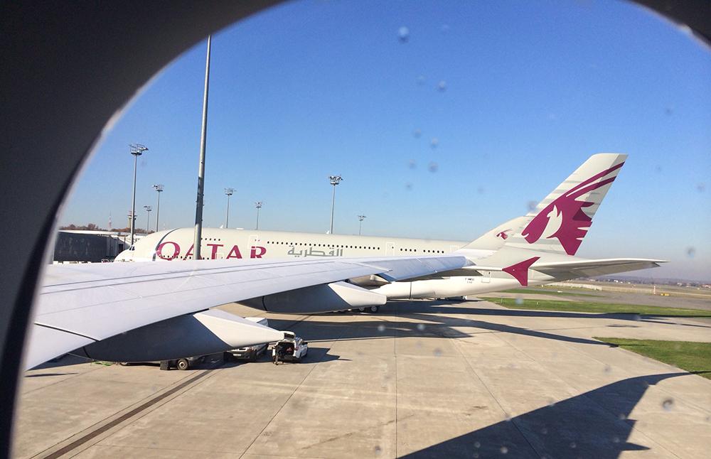 Qatar Airways A350 XWB wing on approach to Toulouse. ATW By Kurt Hofmann