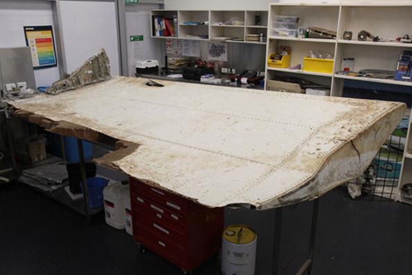 The Australian Transport Safety Bureau (ATSB) has confirmed that a large piece of aircraft debris, found just off the coast of Tanzania in June, is from the Malaysia Airlines Boeing 777 that crashed in 2014 while operating as MH370. Photo: Exemplar part number and date stamp.