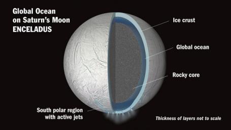 Enceladus is home to a global subsurface ocean that sprays plumes of ice from its south pole.