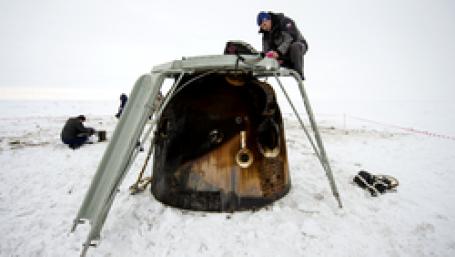Russian officials considered delaying the return of Soyuz TMA-10M from the International Space Station March 11 because of blowing snow and 0F cold at the landing site 230 mi. southwest of the Karaganda staging area, but decided to proceed with a reduced helicopter-recovery force instead. ISS Expedition 38 Commander Oleg Kotov, cosmonaut Sergey Ryazanskiy and NASA astronaut Mike Hopkins later parted ways after 166 days in space, with Hopkins headed straight back to Houston and the cosmonauts returning to their Star City base near Moscow.