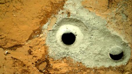 This gray powder from inside a Martian “mudstone” contains sulfur, nitrogen, hydrogen, oxygen, phosphorous and carbon—all chemical ingredients for life as we know it on Earth and a major target of the $2.5 billion Mars Science Laboratory (MSL) mission. In a first for planetary science, the mission's nuclear-powered Curiosity rover drilled the hole at left, after a test run to the right, and transferred some of the powder to its internal chemistry labs.