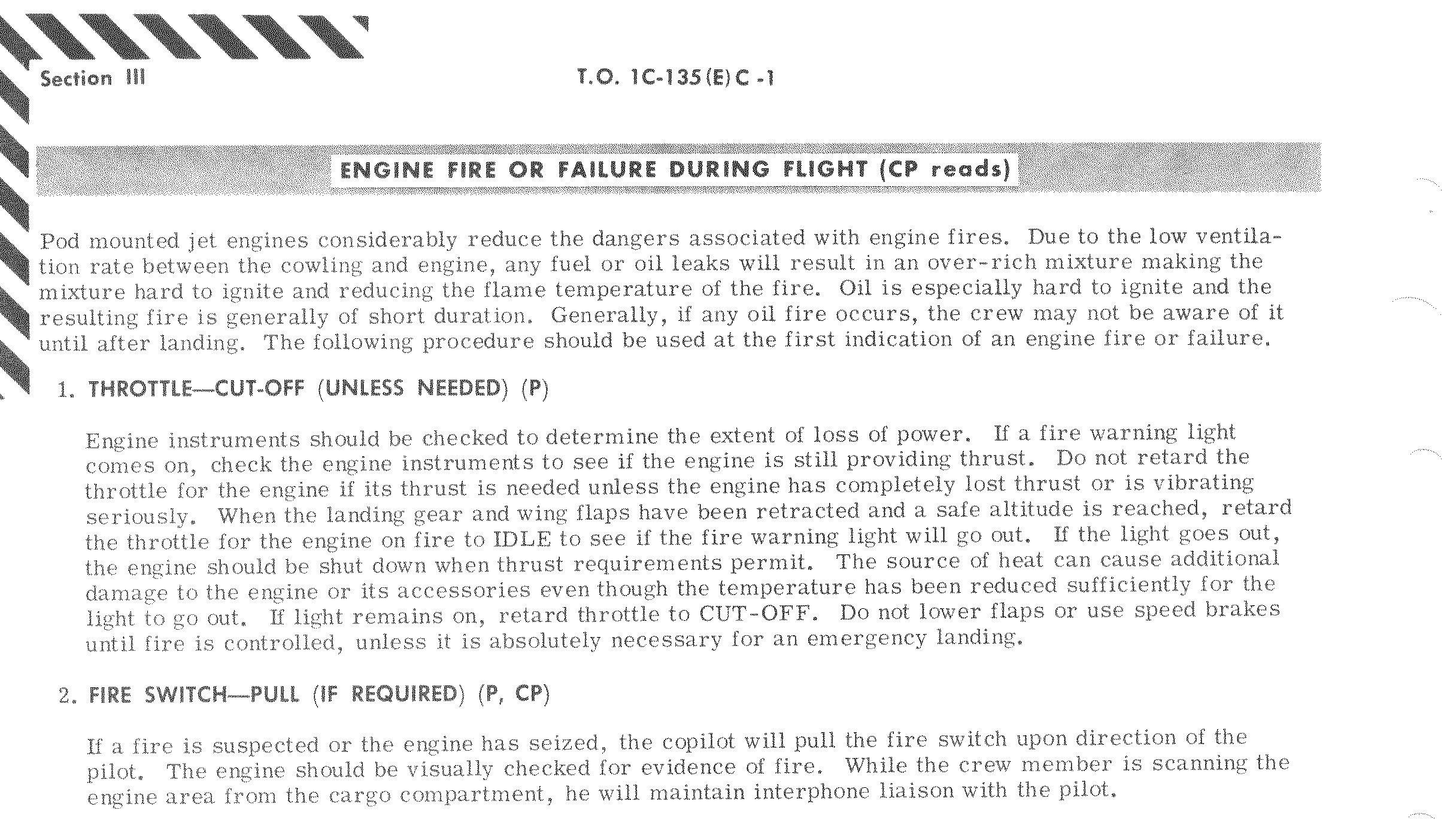 In 1985 I was a fairly new aircraft commander in an Air Force Boeing 707 (EC-135J) based out of Hickam Air Force Base in Hawaii. (The photo shows the airplane at its final resting place in the Pima Air Museum, near Tucson, Arizona.) One of our standard missions was to takeoff at maximum gross weight with a full load of passengers, heading for the Philippines. On one of these trips, the number three engine fire light illuminated. I shut down the engine, turned around and returned home.