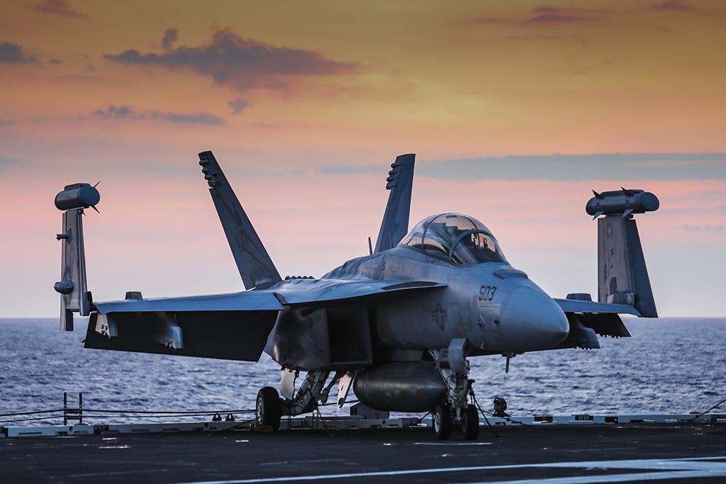 A Boeing E/A-18G Growler sits with its wings folded on the deck of the aircraft carrier USS George HW Bush (CVN-77) as the Sun rises on yet another day of air operations over the Atlantic Ocean.