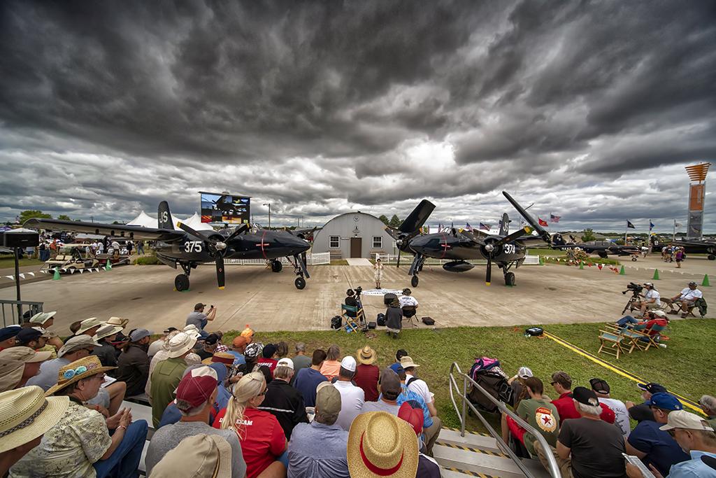 Two Grumman F7F Tigercats at the Warbirds of America stage during a period musical performance by Theresa R. Eaman at Airventure 2018 in Oshkosh, Wisconsin.
