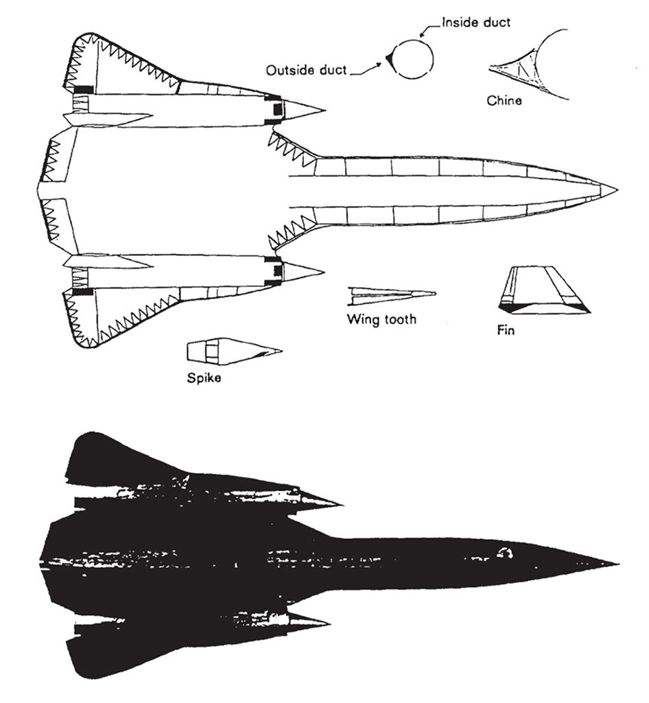 The A-12 and SR-72 also incorporated radar-absorbent materials (RAM) and structures. Some of these are pictured here in this image from a declassified CIA document. The A-12’s outer edge originally consisted of triangular pieces of titanium called fillets. In later aircraft, triangles of resistive honeycomb plastic with glass-fiber surfaces, called “pie panels,” were inserted into the wing’s titanium sawtooth edges and also used to compose the fuselage chines. In addition, the aircraft’s tails were composed almost entirely of RAM, and it had a surface coating loaded with ferrites and laced with asbestos to withstand the 900F temperature of Mach 3 flight.